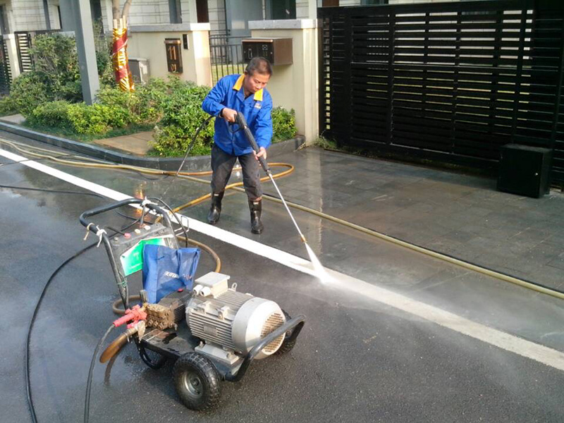 員工用高壓水槍沖洗馬路